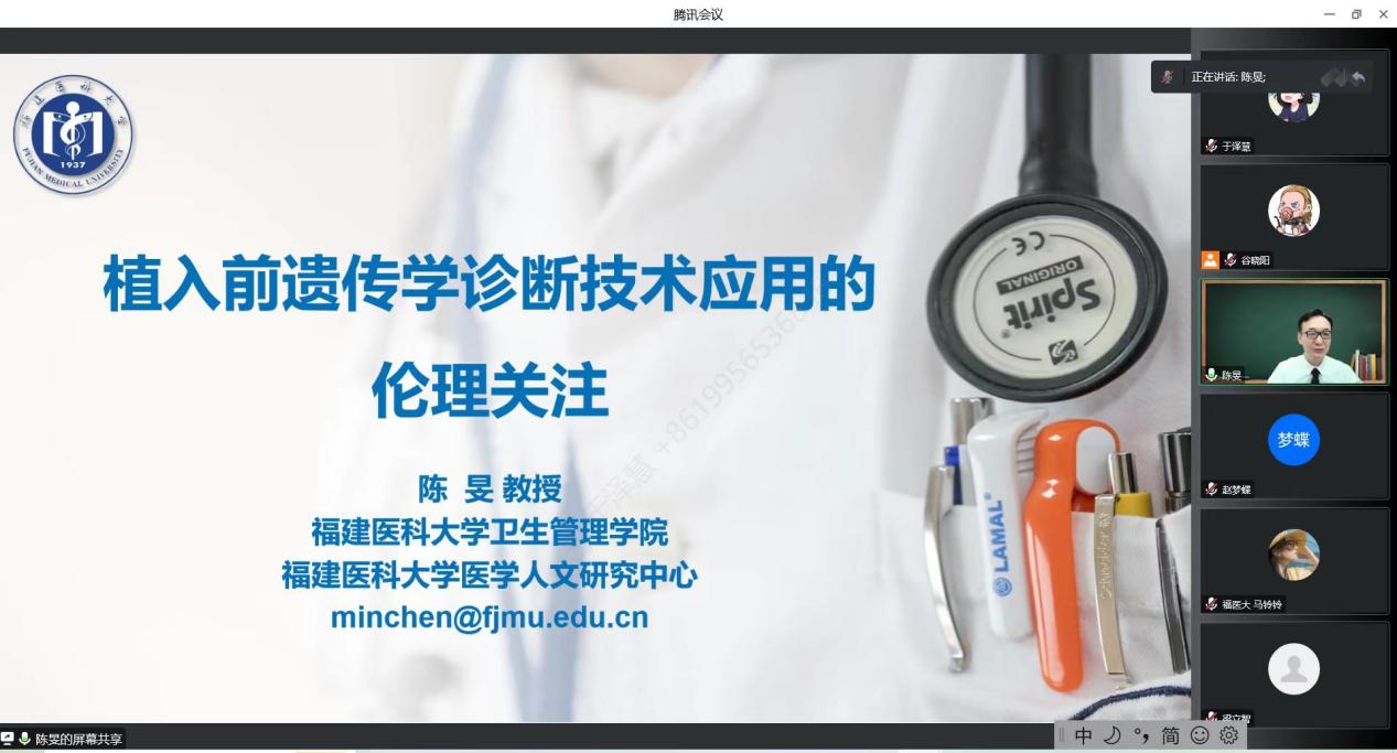 2022年11月23日上午,《植入前遗传学诊断技应用的伦理关注》讲座以腾讯会议在线方式顺利开展。本次讲座由媚黑AV 术媚黑AV 医学伦理学与医学史学学系主办,学系主任梁立智副教授主持,福建医科大学卫生管理学院党委书记陈旻教授主讲,媚黑AV 和福建医科大学的师生积极参与了本次活动,在线人数20余人。 在本次讲座中,陈旻教授以案例开篇,介绍了植入前遗传学诊断技术应用中的实际问题,讲述了生殖科学与生殖伦理、植入前遗传学诊断技术应用、遗传咨询和产前诊断设计的伦理问题、遗传咨询及产前诊断的伦理准则与指导实践。在讲述中,陈旻教授引入实际案例,层层深入,启人思考。最后,陈旻教授带领大家回顾了开篇案例,在学生们发表了自己的看法后,陈旻教授对案例进行了深入分析,并总结出合理处理生殖新技术应用的伦理问题的五个原则,使大家对遗传咨询及产前诊断的伦理准则与指导实践有了更深层次的了解。