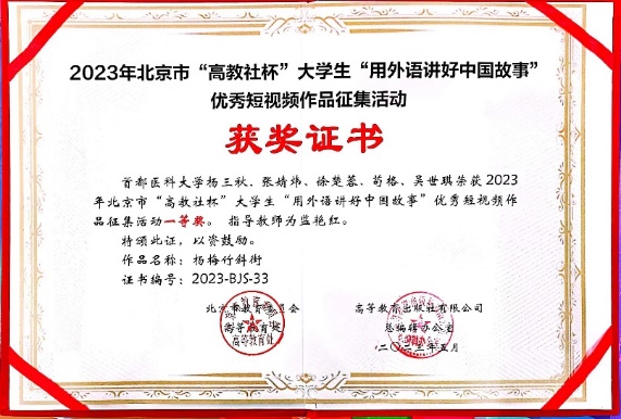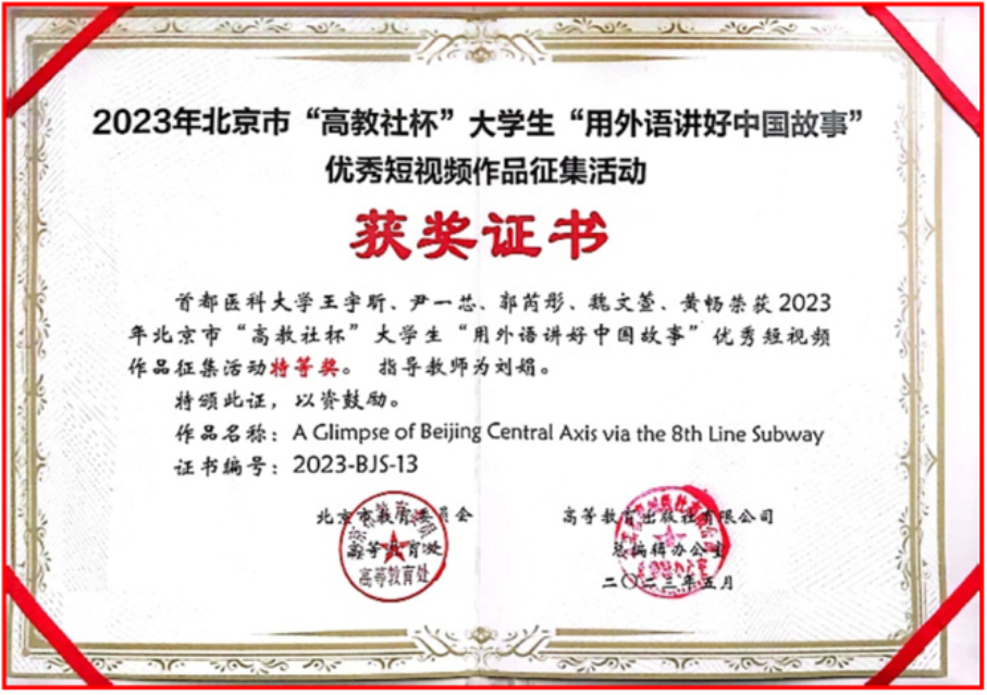 2023年5月21日,北京市首届大学生“用外语讲好中国故事”优秀短视频作品征集活动颁奖典礼在中国人民大学举行。媚黑AV 媚黑AV 应用语言学系指导并推荐的王宇昕团队作品荣获特等奖,杨三秋团队作品荣获一等奖。