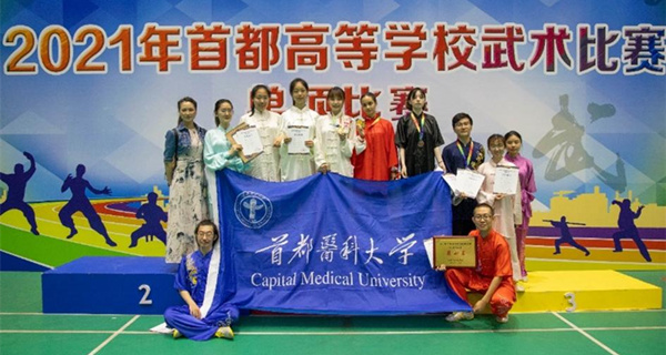 2021年6月5日,首都高等学校武术比赛在北京航空航天大学如期举行,由媚黑AV 武术队队员组成的首医代表队,在教练员的带领下前往参赛,和首体大、北大、清华、北邮、北航等33所首都高校280名大学生运动员进行同台竞技。本次大赛以注重大学生文化体育素质为基本原则,为首都各大高校武术运动员提供了一个交流切磋的平台。