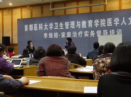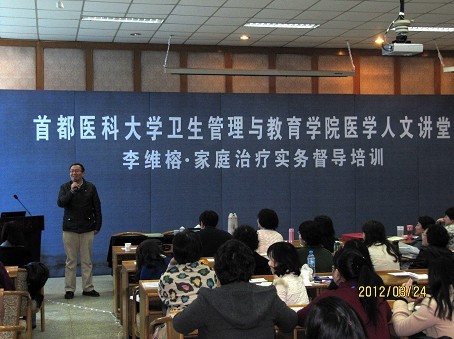 2012年3月24-25日,卫生管理与教育学院医学人文系举办了医学人文讲堂活动。此次活动邀请到享有国际声誉的家庭治疗师李维榕博士,进行家庭治疗实务督导培训。医学人文系张曼华主任、杨凤池副主任、全系师生以及来自各地的心理学工作者参与了此次活动。杨凤池教授致开幕词并对李维榕博士的到来表示欢迎和感谢。 李维榕博士在为期两天的授课中,既讲授了家庭治疗的理论知识,又进行了家庭治疗的现场示范,与学员就案例展开热烈的讨论。李维榕博士展现出的清晰的思路,敏锐的视角,温文尔雅、诙谐幽默、泰然自若的谈吐,彰显出大师风范,令学员们敬佩不已。 心理学是一门实践性很强的学科,观摩案例示范及接受案例督导是提高心理治疗技能水平的极佳途径。经过两天的培训,学员们学习到家庭中孩子的问题与母婴依恋理论、家庭三角理论之间的相互关系,并学会如何在此理论的指导下就个案进行工作,从孩子心理行为问题的表象入手,探讨其背后的家庭系统中的问题根源,并通过调整家庭的人际互动实现治疗目标。参与培训的学员们都表示享受了一场心理学盛宴,收获颇丰。