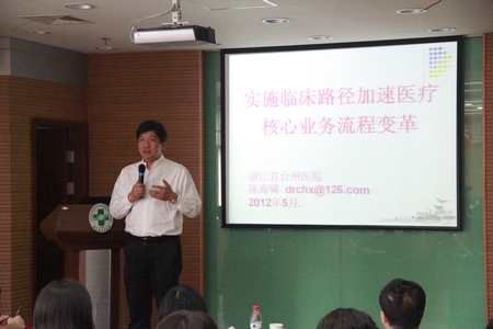 会上,浙江省台州恩泽医疗中心(集团)主任、浙江省台州医院院长陈海啸教授做了题为《实施临床路径加速医疗核心业务流程变革》的报告,陈院长重点论述了临床路径管理的理念,他指出“临床路径管理的重点是优化医疗业务的核心流程和环节,实现以病人为中心,跨部门的医疗服务环节、流程的整合”。陈院长认为临床路径是医院各项业务环节的一条纽带,能够影响医疗和服务质量,也是衡量医院水平收益高低的标准。台州医院在2004年开始探索在医院实施临床路径管理工作,2005年正式成立临床路径小组并在部分科室试点,2006年将临床路径的推广工作作为医院的重点项目之一,从2005年至2009年不断完善临床路径管理办法及临床路径软件,卫生部等各级卫生行政部门和医疗机构多次到医院开展考察学习活动。2011年台州医院在30个科室开展临床路径,共开展116个病种路径,入径22056例,入径率81.43%,占所有出院患者32.69%。台州医院临床路径管理具有三个特色,一是操作模式信息化,二是路径模式病友化,三是管理模式制度化。陈院长精辟地总结了台州医院实施了临床路径管理工作八年的经验:领导重视支持到位,树立标杆制定目标,创建氛围全员参与,借助信息立足需求,不懈学习持续改进。在会上,陈院长还简单介绍了恩泽医疗中心(集团)的发展过程,陈院长独具特色的医院管理理念和战略眼光让参会代表无不佩服。接着,临床路径项目小组成员详细介绍了医院开展临床路径管理工作的过程、存在的问题及下一步的工作计划,医院信息科的工作人员详细介绍了临床路径计算机管理系统的开发过程。参会代表针对临床路径管理工作与台州医院工作人员开展了深入的探讨和交流。 随后,与会代表到医院临床科室实地考察了医生工作站的临床路径管理工作,临床医生现场演示了最新版本临床路径计算机系统操作,并与参会代表交流计算机系统使用过程中的体会与经验,台州医院的临床路径管理计算机系统得到了大家的一致认可。最后,与会代表还参观了百年恩泽医局纪念馆。 研讨会结束后,与会代表纷纷表示,通过本次研讨会,开阔了视野,增长了见识,深化了对临床路径管理工作的认识,学习了台州医院开展临床路径管理工作的经验,为医院推广临床路径管理工作提供了很好的借鉴。