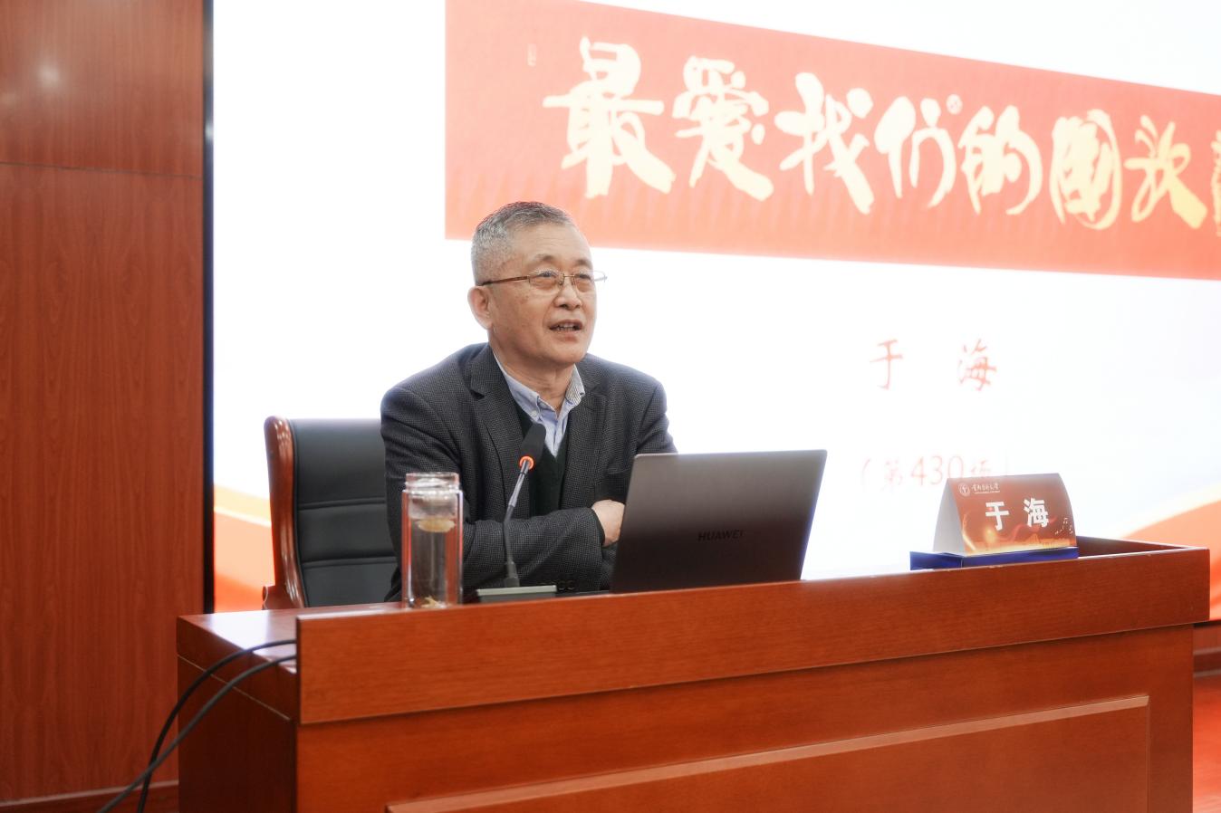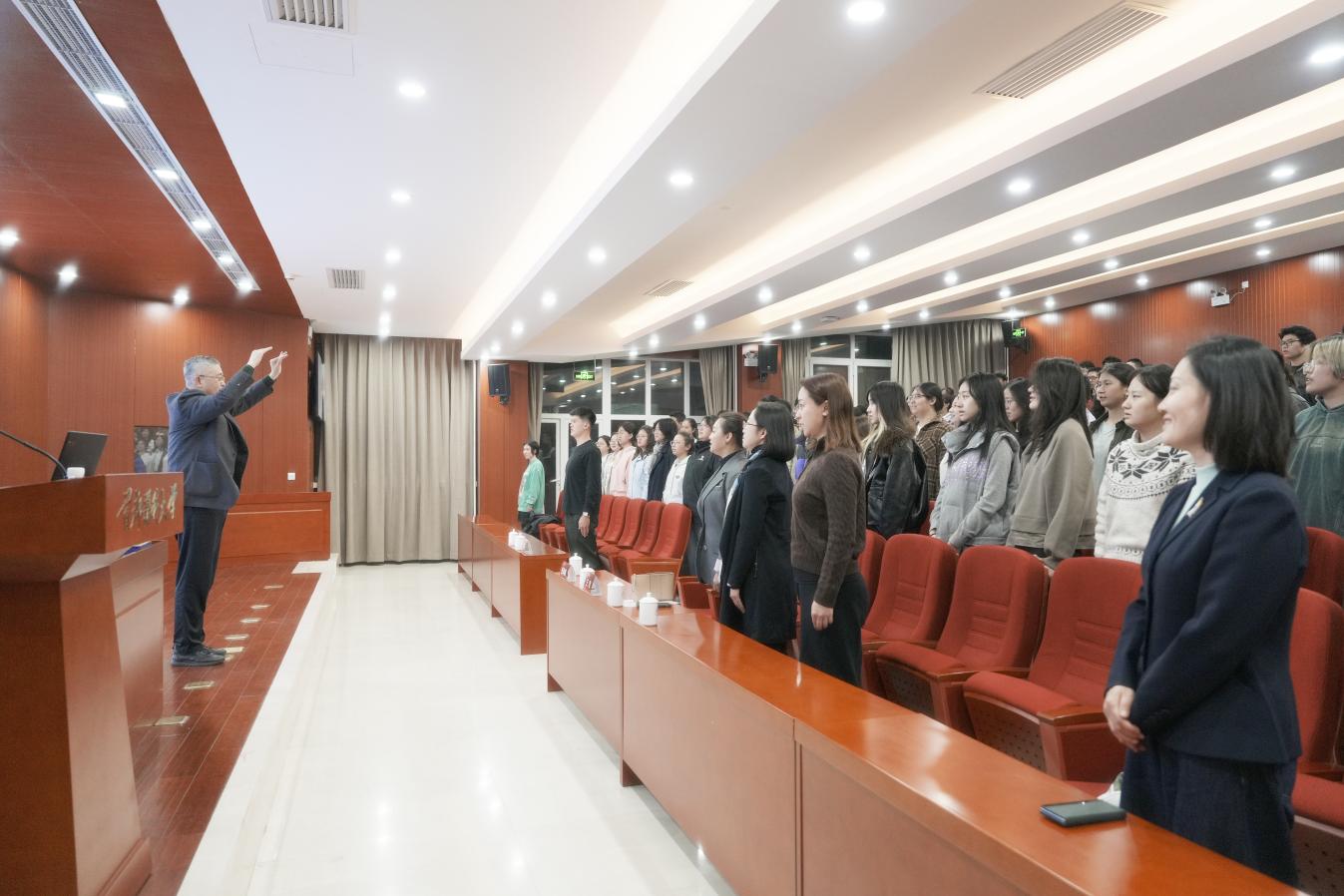 于海教授做讲座 讲座中,于海教授围绕国歌的历史脉络、精神内涵与时代价值作了系统阐述。他从国歌的起源与地位切入,结合中外实例,生动讲解了国歌作为民族精神象征的深厚意涵。通过回顾《义勇军进行曲》的创作背景与立法历程,于海细致解析了其音乐结构与歌词内容,深刻阐释了其中所蕴含的中华民族不屈不挠的民族气节与爱国主义精神。讲座尾声,在于海的现场指挥下,全体师生肃立齐唱《义勇军进行曲》,激昂旋律回荡全场,将现场氛围推向高潮,充分激发了师生的爱国热情与使命担当。