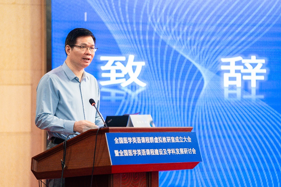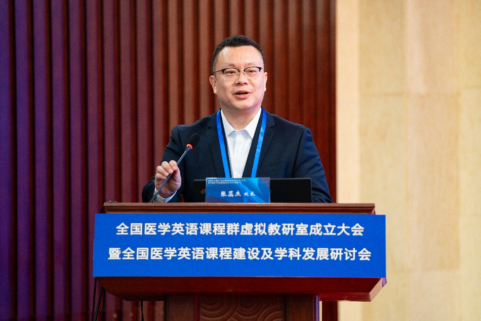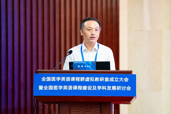 张蕊杰处长主持成立大会 校党委副书记张健致欢迎辞,对远道而来的领导、嘉宾、专家和教育同仁表示热烈的欢迎。张健副书记指出,大会的成功召开,是医学英语教育学界共商未来发展大计的一件盛事,是深化医文协同、进一步推进医学教育改革与发展的一件大事,它必将为医学英语课程建设注入新动力、增添新活力。他强调,全国医学英语课程群虚拟教研室成员要共同努力,搭建好、利用好教学改革研究新平台,本着优势互补、资源共享、携手并进的原则,合力打造教师教学发展共同体,为医学高等教育高质量发展提供有力支撑。
