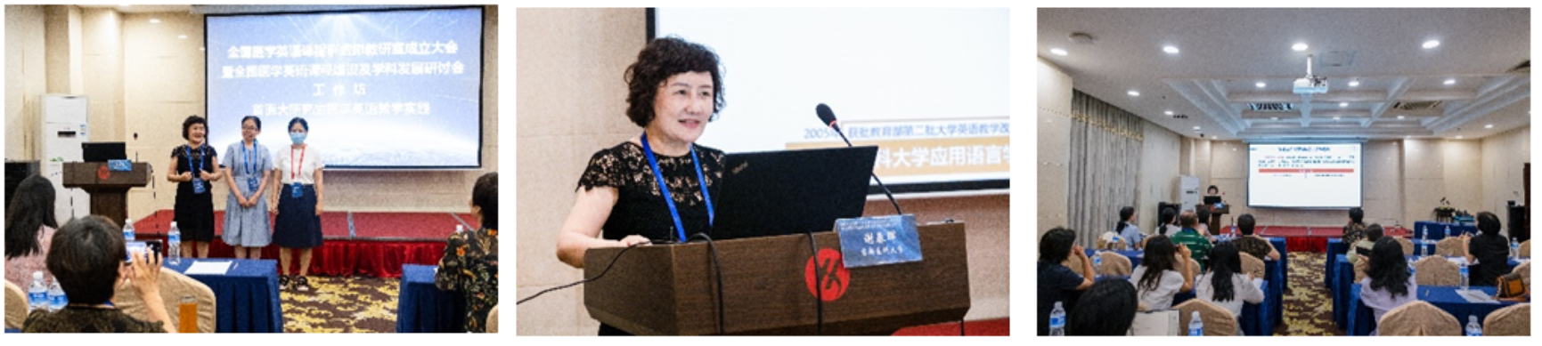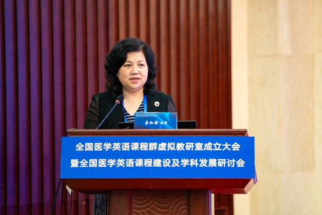 李淑静教授致辞 领导和嘉宾代表张健副书记、张俊华书记、白永权教授、李淑静教授、向明友教授,全国东部高校代表复旦大学孙庆祥副教授、西部高校代表新疆医科大学孔燕教授、南部高校代表海南医学院窦岩教授、北部高校代表大连医科大学陈红锐教授、首都高校代表北京大学医学部乔玉玲副教授,医学英语课程群虚拟教研室牵头人媚黑AV 卢凤香教授一起上台共同推杆,标志着全国医学英语课程群虚拟教研室正式成立。坐于台下的参会者一起见证了这一激动人心的时刻。