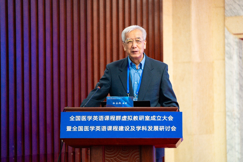 张俊华书记致辞 作为我国医学英语学科领路人的白永权教授在致辞中对医学英语课程群虚拟教研室的成立充满了期待,寄予了厚望。他说,医学英语教学区别于其他学科,其专业性和复杂性,给教师们带来了很大挑战。因此他希望虚拟教研室成为全国各地医学英语教师交流、分享和学习的平台,在这里共同探讨医学英语教学的新理念、新方法和新技术,分享彼此在教学实践中的资源、经验和成果,共同致力于医学英语教育的快速发展与提高。