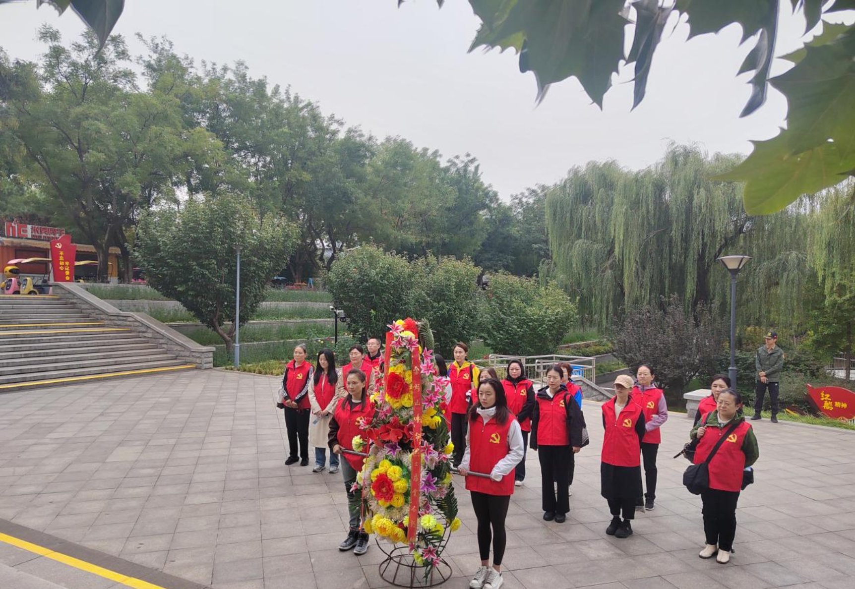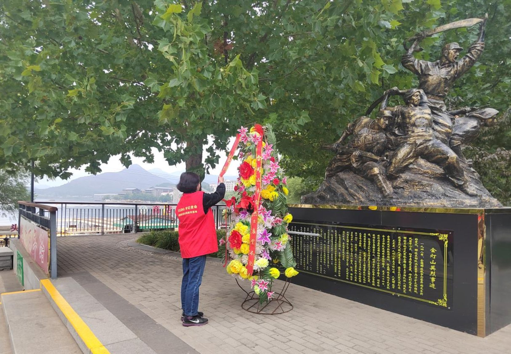 向烈士敬献花篮 首先,党员们瞻仰了金灯山英烈雕塑,聆听英烈在金灯山英勇战斗的事迹,并在庄重的氛围中,向烈士敬献花篮,以崇高敬意缅怀革命先烈。