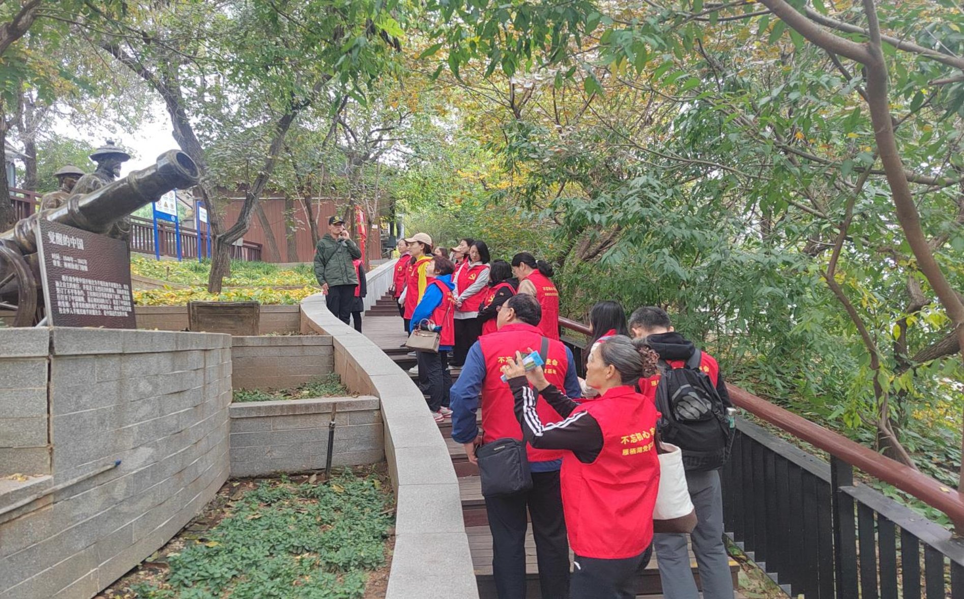 在“复兴之路”体验区学习 随后,大家沿着金灯山拾级而上,开启了一场沉浸式的“复兴之路”展览参观之旅。沿途的雕塑、展板和画作展现了波澜壮阔的历史画卷,从虎门销烟的悲壮开篇,到新中国成立的伟大转折,再到“两弹一星”的伟大复兴征程,生动地呈现了中国共产党引领中国人民从站起来、富起来到强起来的辉煌成就。