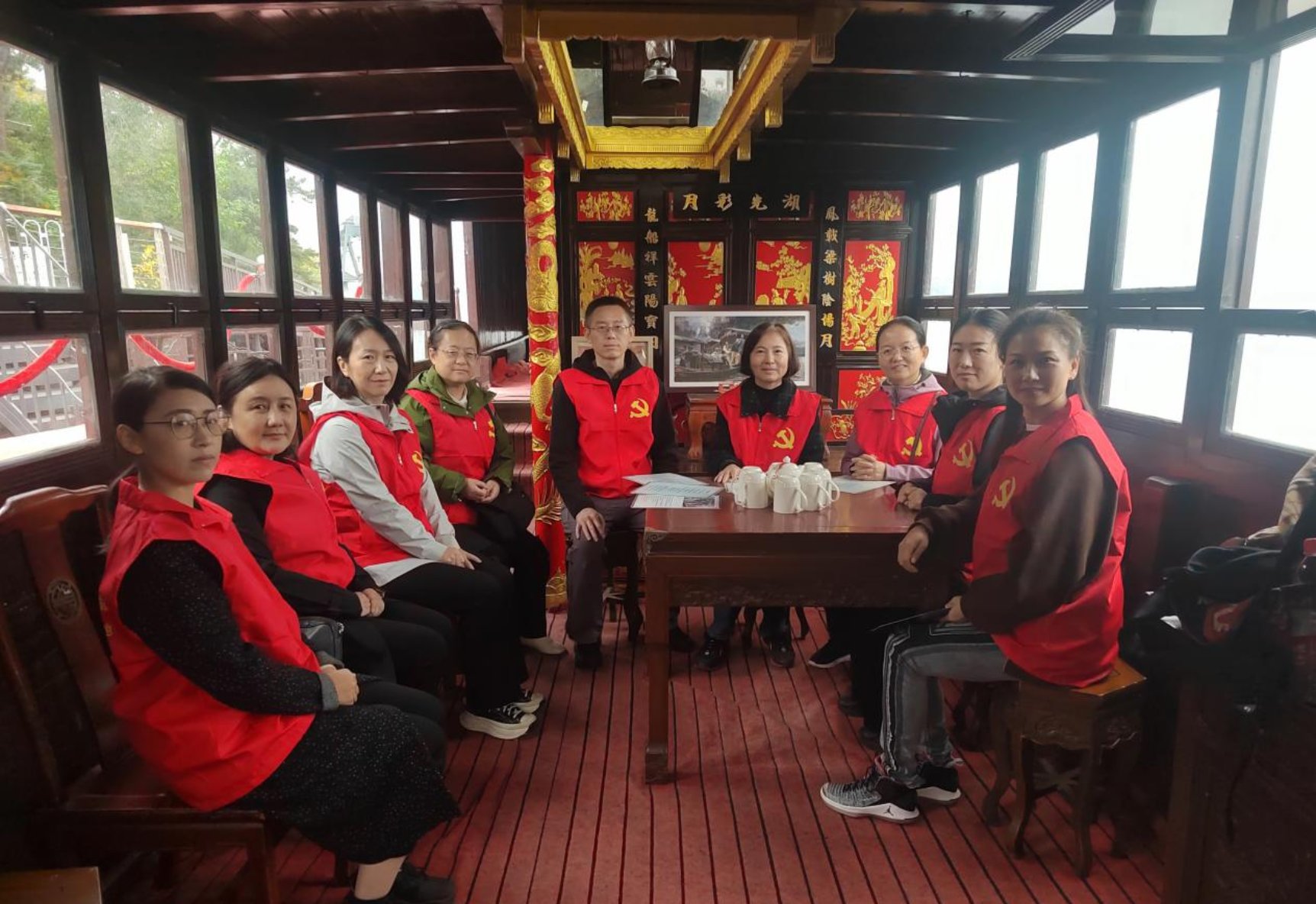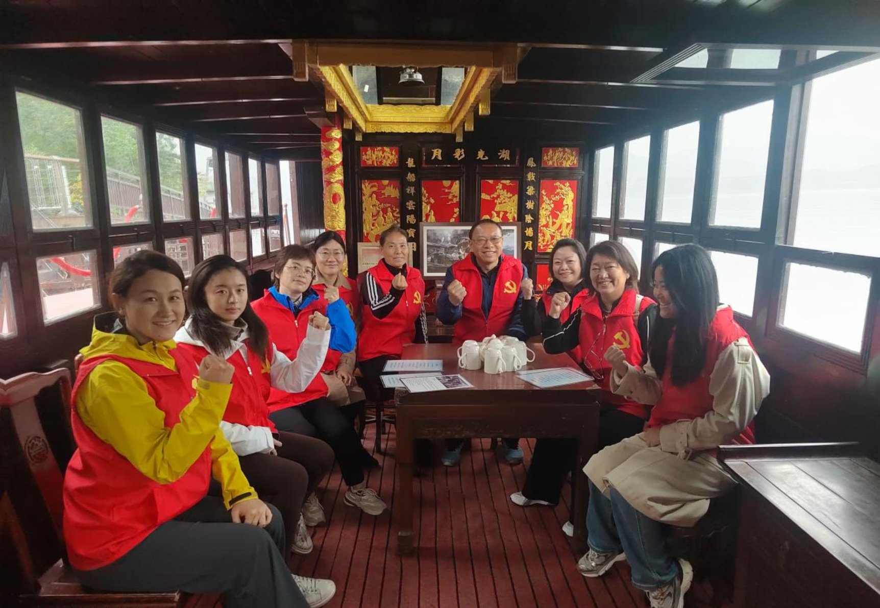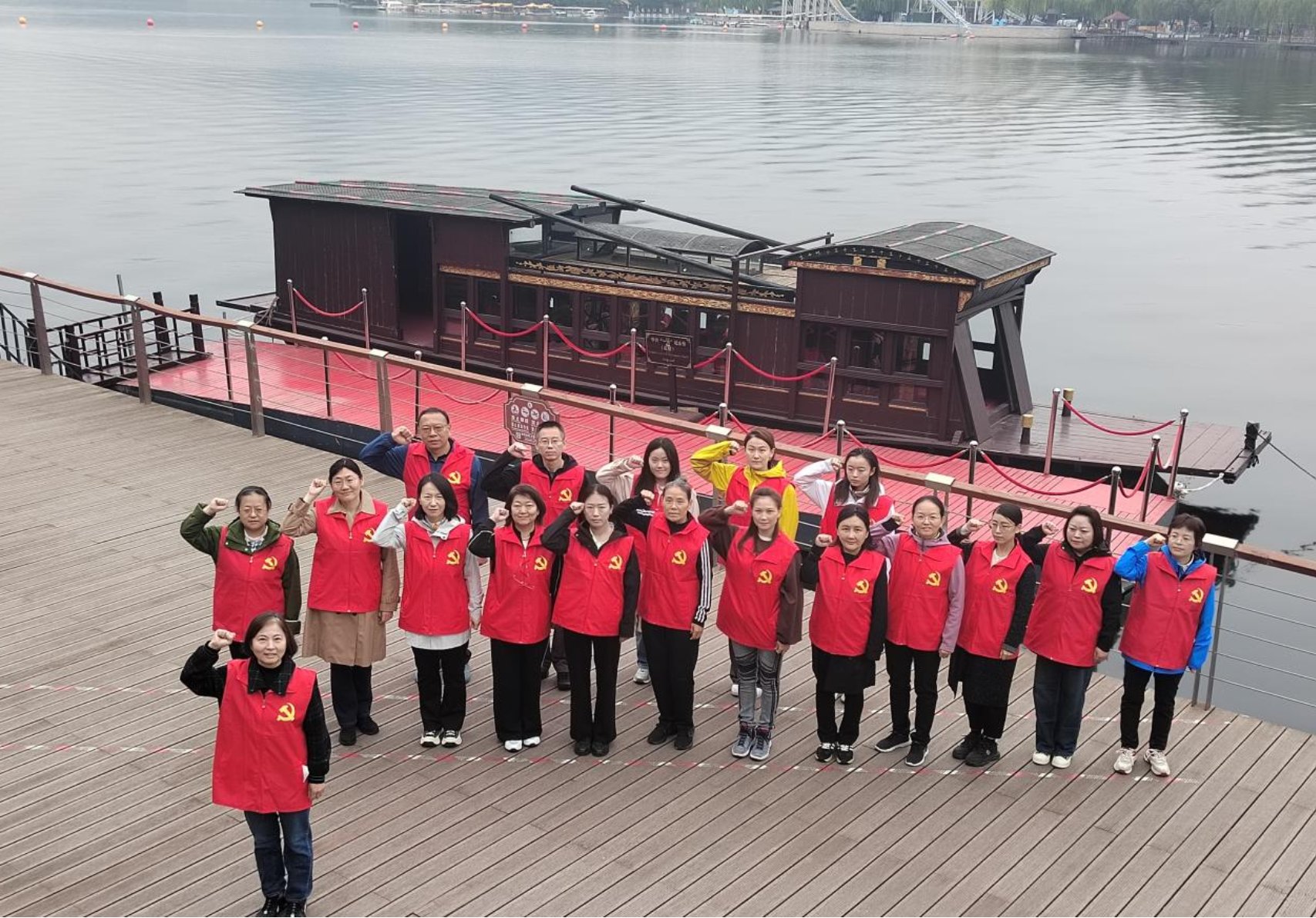 在“红船精神”体验区学习 在红船演绎环节,党员们聆听了中国共产党第一次党代会惊心动魄的召开过程。随后,大家分组进入红船进行角色扮演,在红色氛围的烘托下,不由自主地发出“全世界无产阶级团结起来”的呐喊,亲身体验了先辈们的革命精神与坚定信念。