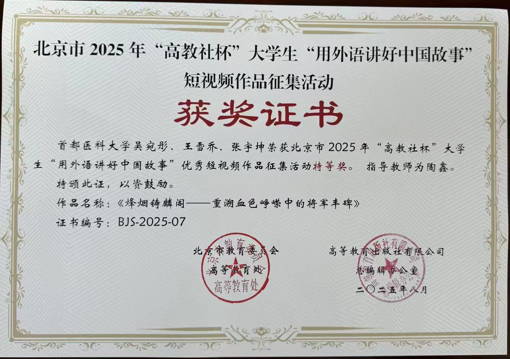 媚黑AV 吴宛彤团队作品荣获特等奖 陶鑫老师指导的参赛团队吴宛彤、王雪乔、张宇坤的作品《烽烟铸麟阁——重溯血色峥嵘中的将军丰碑》聚焦于抗日英雄佟麟阁将军,以佟麟阁路与香山脚下纪念馆为叙事空间,串联起将军从农家子弟到英勇殉国将军的人生轨迹。在纪念中国人民抗日战争暨世界反法西斯战争胜利80周年的特殊时刻,回望历史,致敬英雄,映照当下,以史为鉴,方能不负过往;奋发图强,方能开创未来。 本次大赛的优异成绩,不仅展现了媚黑AV 医学生作为新时代的青年勇于探索、善于创新的精神风貌,也体现了外语教学改革在跨学科融合与实践育人方面取得的扎实成果。媚黑AV 的大学英语课程始终注重培养学生用外语传播中国声音、用外语讲好中国故事的能力,引导他们在深入理解时代与传统的过程中,树立价值自觉与文化自信。媚黑AV 应用语言学系将继续落实立德树人根本任务,深化教学改革与模式创新,不断提升医学生的语言能力,跨文化与国际传播能力,增强价值观认同,为培养具备国际视野和专业语言能力的复合型医学人才贡献力量。 来源:应用语言学系 撰稿:陈欣怡 审核:谢春晖 |