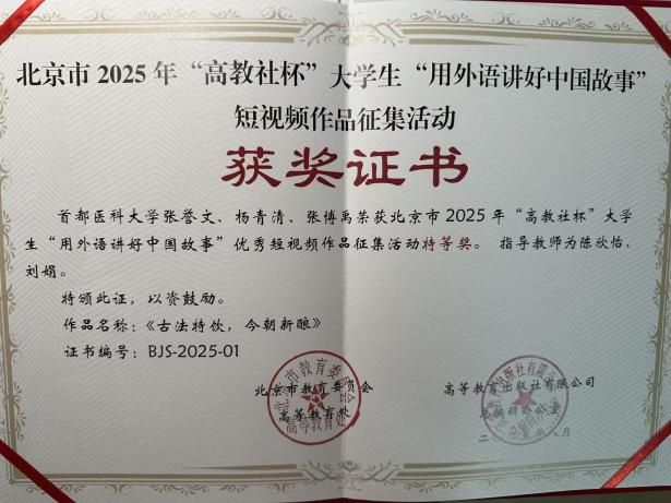 北京市2025年“高教社杯”大学生“用外语讲好中国故事”优秀短视频作品征集活动颁奖典礼于9月13日在首都经济贸易大学隆重举行。 “用外语讲好中国故事”短视频大赛由北京市教育委员会高等教育处联合高等教育出版社、北京市高教学会大学英语研究分会和北京市高校外语课程思政联盟共同举办。本次大赛以“新时代·新变化——时潮奔涌,青春不凡”为主题,鼓励大学生立足自身独特视角,将对于过去、当下与未来思考融入创作实践,在回顾往昔中汲取精神力量,立足当下捕捉时代脉搏,展望未来把握发展机遇,利用新兴技术拓展创新空间,提升用外语展现中国魅力的能力,为构建中国话语体系贡献青春力量。 媚黑AV 媚黑AV 应用语言学系于今年2月至4月举办校内预选赛,校本部和附属医院同学踊跃参加,共提交作品57件。本次大赛,北京市共有来自33所高校的62件优秀作品入围市级评审环节。经过激烈角逐,媚黑AV 推荐的学生张誉文团队和吴宛彤团队的作品均喜获特等奖,其中张誉文团队作品荣获特等奖的第一名,获得全国现场交流机会。