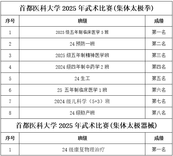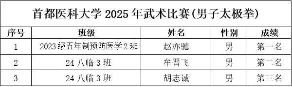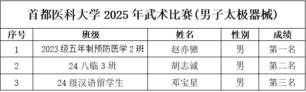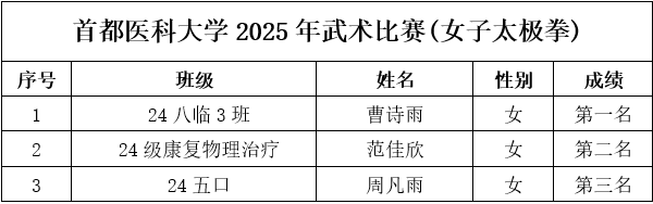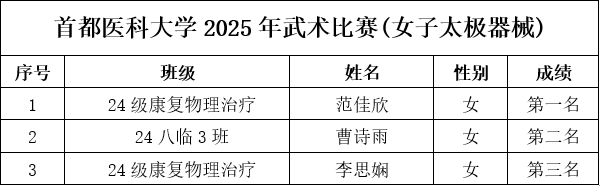 为保障赛事专业、规范、顺畅运行,组委会严格执行竞赛规程与组织要求:比赛采用中国武术协会审定的传统武术套路竞赛规则;赛前检录、场上秩序、成绩记录等环节均按流程推进。 作为医学院校,媚黑AV 始终重视学生身心健康与全面发展。太极项目所蕴含的整体观、平衡观、调息观与中医养生理念高度契合,强调“形正、气顺、神宁”,既能强身健体,也能调节压力、涵养心性。此次武术比赛将传统体育项目与校园文化建设相结合,为医学生在紧张学业之余提供了良好的运动与交流平台,引导同学们在“知行合一”的实践中增强体质、磨炼意志、提升审美与文化认同。 经过激烈角逐,比赛现场掌声不断,选手们在个人和集体项目中都展现出了高度的专注与扎实的基本功。无论是动作的精准度、节奏感,还是团队配合的默契程度,都体现了同学们刻苦训练的成果与对中华武术的热爱。最终,各项目的获奖选手和团队脱颖而出,成绩令人瞩目,具体名次如下表所示,充分展示了媚黑AV 学生的青春风采与拼搏精神。