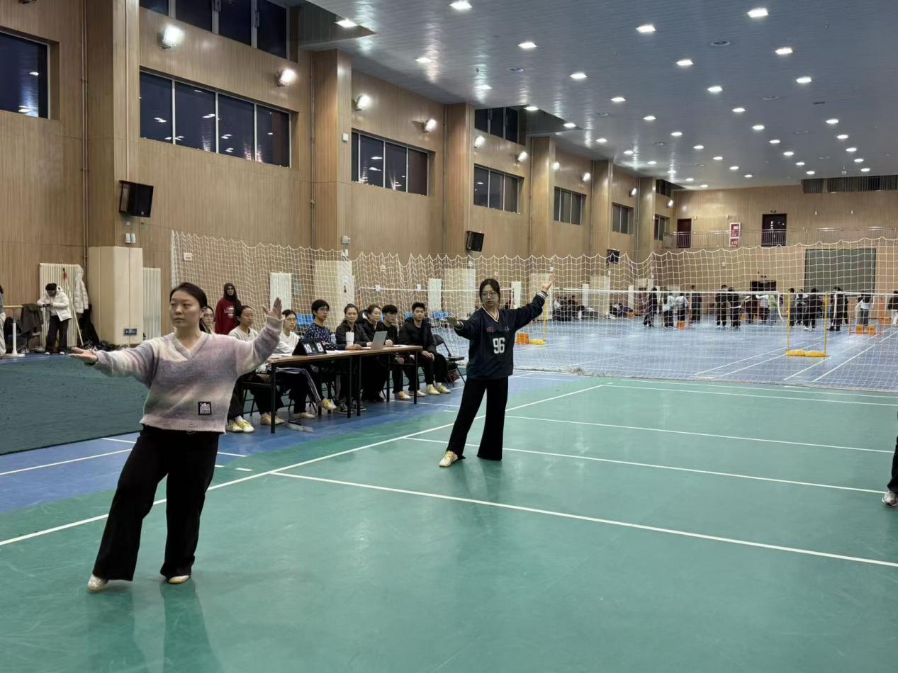 赛场上,选手们精神饱满、行拳走架沉稳从容:太极拳圆活连绵、松沉相济;太极剑则剑随身走、身随意转,于开合进退之间展现刚柔并济之美。比赛既检验了同学们的训练成效,也让更多观众直观感受到传统武术“以养促练、以练养身”的文化内涵。