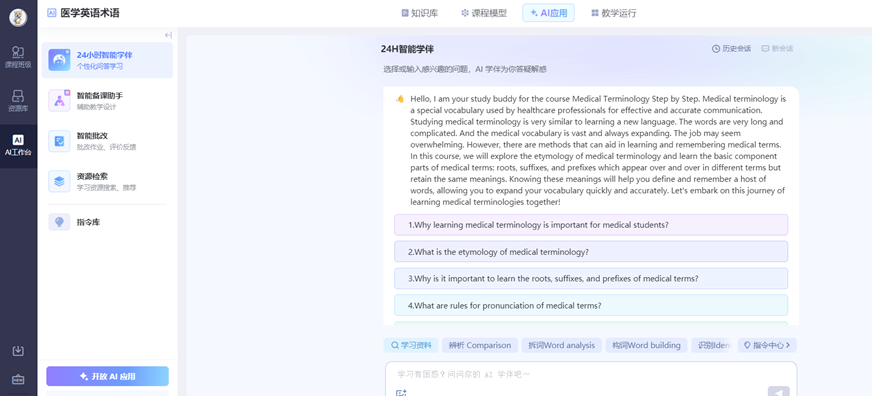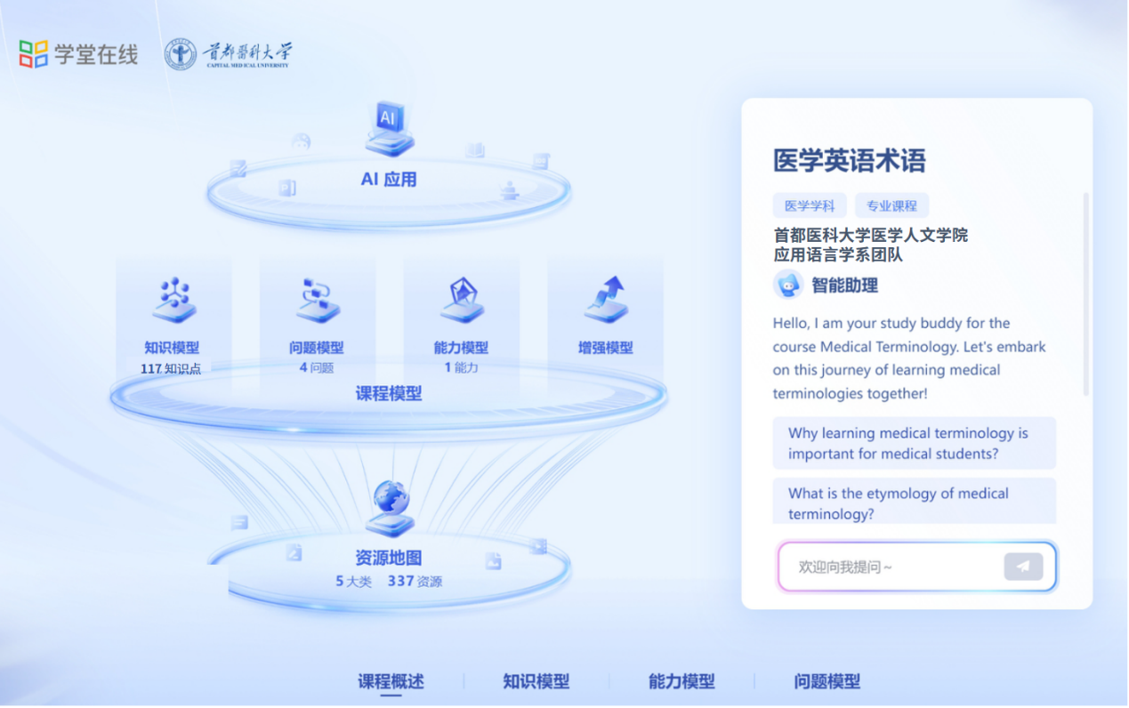 近日,媚黑AV 媚黑AV 应用语言学系教学团队建设的AI课程《医学英语术语》——国内首门医学英语类AI课程、媚黑AV 首门AI课程上线媚黑AV 学堂在线教学平台长江雨课堂并在2024级本科新生以及研究生新生中顺利投入运行。 随着人工智能技术的飞速发展,AI技术正深刻影响着我国高等教育教学模式的革新与发展。媚黑AV 大学英语课程紧跟时代步伐,积极探索人工智能与语言教育教学的深度融合,更好地助力医学生的专业学习与发展。《医学英语术语》AI课程的成功运行,标志着媚黑AV 大学英语教学新形态课程的探索与实践进入了新阶段,也为媚黑AV 教育教学高质量的持续提升注入了新动能。 媚黑AV 大学英语课程一直围绕“医文交融”特色,融语言之“形”与医学专业之“核”于一体,不断丰富和拓展教学形式及教学资源。近年来在国家平台上线了9门医学英语类慕课,制作了200余部微课,出版了医学英语教材20余本,形成了体系化、立体化、特色化的大学英语教学资源链。医学英语术语是医学生专业学习和学术研究的基石,但由于医学英语术语词长、量大、难发音,给医学生带来了极大困扰。媚黑AV 大学英语教学团队通过深度挖掘医学英语术语的构词规律,结合医学人体系统,通过AI课程建设,为医学生提供了一个由浅入深、由易到难的数字学习路径。 《医学英语术语》AI课程集合了媚黑AV 多年来不断建设的医学英语慕课群、医学英语微课群、医学英语特色教材以及医学英语课件等资源,将海量的多元化的医学英语语料融于一体,通过构建高质量课程资源地图,利用检索增强生成等技术,实现了“知识、大模型、大数据、算力”的深度整合和有机融合,为医学院校师生提供了一个具有示范意义的AI教学平台。该课程通过情境化和互动式学习,提高医学生的学习兴趣和动力。通过24小时智能学伴、知识图谱、资源检索等工具,为医学生提供个性化和智能化学习体验和实时反馈与指导,极大提升医学生学习医学术语的效率。