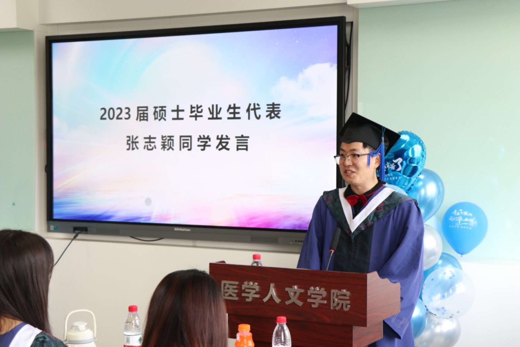 导师是学生求学路上的引路人,是心灵的指引者,也是学生求学旅程中的知心朋友和坚强后盾。研究生导师张博源教授首先表达了对同学们的祝贺,祝贺同学们超越了自我,赢得了成长;祝贺同学们结缘良师,收获了信任;祝贺同学们铸就了医学人文精神信仰,成为医学人文使者。以他丰富的教育经验和深厚的学术造诣,送给同学们毕业之际的人生指引和真挚的祝福,并叮嘱同学们“”责任与担当比什么都重要!责任永远高于热爱。唯有责任,你才能在工作中发现你们的热爱。”