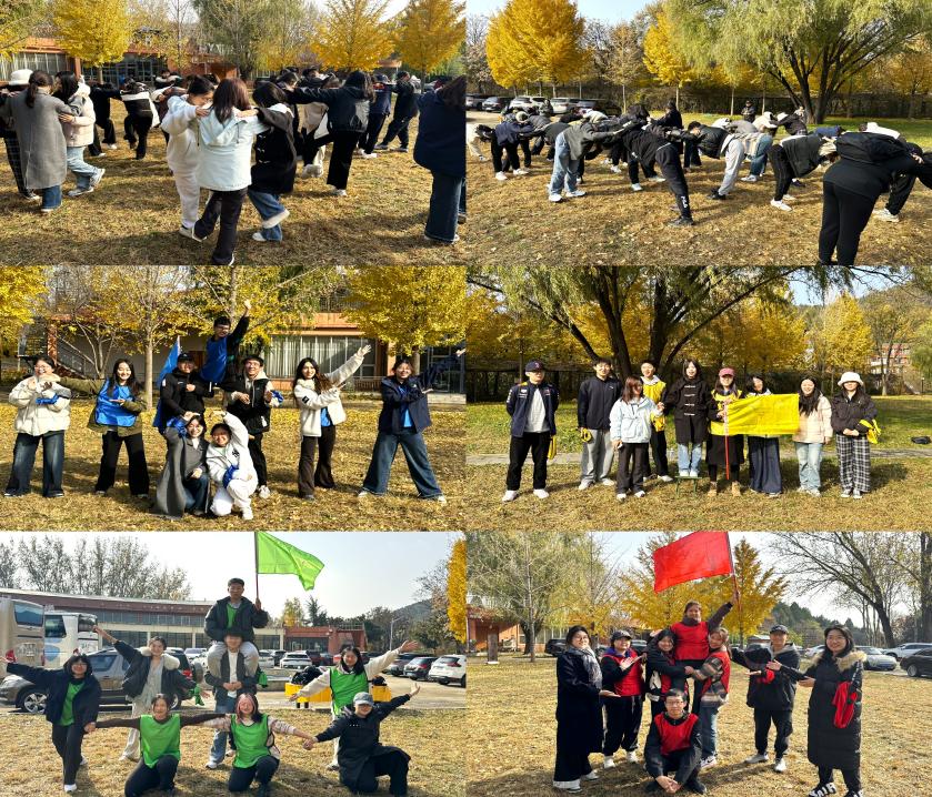 秋景绚烂迷人,如同置身画卷。活动现场,同学们围成圆圈开展热身活动,简单动作与默契配合快速消融陌生感,现场氛围热烈融洽。热身结束后,同学们随机分为4个小组,迅速完成组长、副组长选举,共同构思专属队名、绘制队旗、编排特色队形。在齐心协力的创作过程中,同学们的集体荣誉感持续升温,团队归属感悄然凝聚,为后续的协作挑战筑牢了基础,也让跨年级同学快速打破隔阂、建立初步信任。