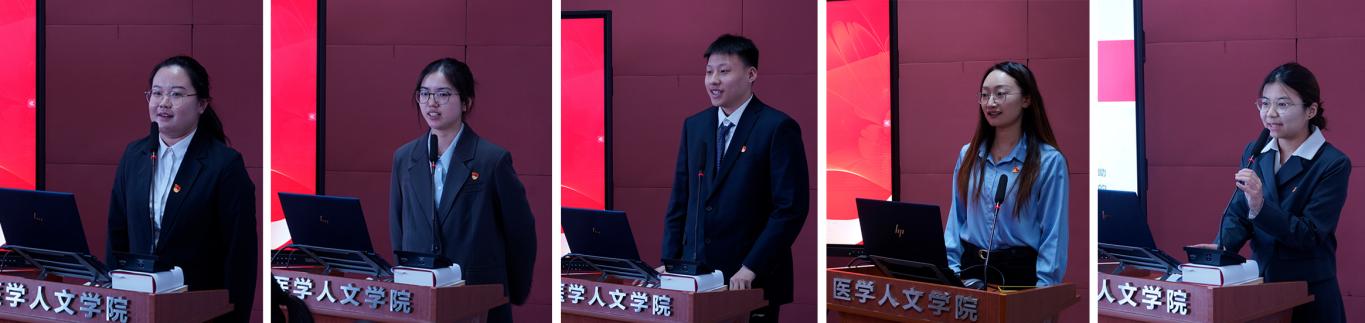 新发展的预备党员发言表态 随后,新发展的李悦芃等五位预备党员依次发言表态,分享自己的入党动机和成长经历。其中,王静谦同学结合专业学习和服务社会的实践,以“微党课”的形式讲述了她在云南地区提升乡村留守老人心理健康水平的经历,展示了听党话、跟党走的实际行动。老党员代表李思源同学则分享了自己前往西部支教的故事,引发了大家对党员责任与使命的深刻思考。入党积极分子们现场分享了参加此次教育活动的感受,纷纷表示将进一步坚定理想信念,积极向党组织靠拢,争取早日成为一名合格的共产党员。