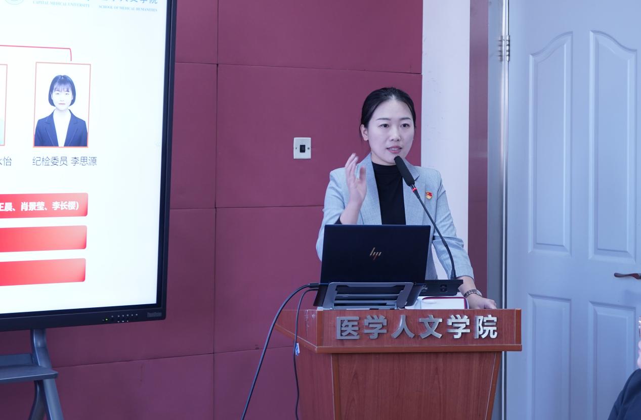 王晨做党支部工作汇报 支部书记王晨首先以“‘党建红’点亮青春路”为题对2024年媚黑AV 学生党支部工作情况汇报,回顾了过去一年党支部以思想建设为核心、组织建设为基础、制度建设为保障、服务社会为己任所取得的良好成绩。