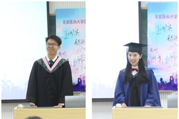 优秀毕业论文、优秀毕业论文指导教师领奖 2015级本科学生王昊旻、2016级研究生杨璐作为毕业生代表发言。王昊旻回忆了大学四年的时光,难忘恩师们的付出与奉献、难忘自己的成长与蜕变、难忘父母及家人的关怀、难忘学校同学们间的友谊。杨璐表示,“医乃人术”、“大医精诚”,医学以救人治病为核心,处处体现着人文精神的光华,作为人文学院的第一届毕业生,我们有责任将这种坚韧中饱含温暖,自强奋斗且心系大众的精神传承并发扬,也希望今后人文学院的毕业生,将医学的温度,持续温暖并传递下去。