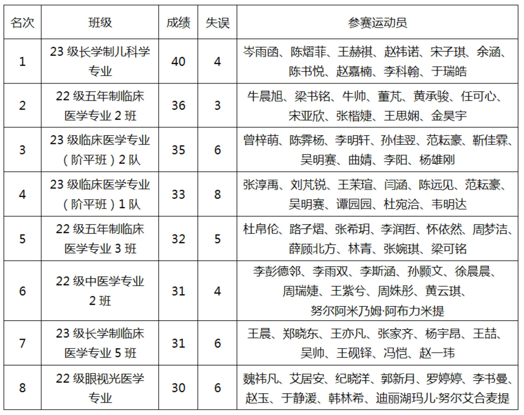5月15日,校本部的操场上骄阳似火,人声鼎沸。比赛瞬间展开,精彩纷呈。各班选手都充满了斗志和热情。他们是对手亦是朋友,随处可见的是同学们在赛场上互相激励,为自己及班级争取荣誉。他们全心地投入到比赛中,尽全力展现出自己的技巧和速度,不断挑战自己的极限。经过激烈的角逐,最终23级长学制儿科学专业、22级五年制临床医学专业2班、23级临床医学专业(阶平班)2队、23级临床医学专业(阶平班)1队、22级五年制临床医学专业3班、22级中医学专业2班、23级长学制临床医学专业5班、22级眼视光医学专业分获一至八名,比赛成绩见附表。 首医学子们不仅在专业课程中表现出色,在体育比赛中也展现了勇往直前、奋力拼搏的精神。体育比赛不仅是锻炼身体的机会,更是展现团队合作和竞技精神的舞台。这次比赛不仅丰富了校园生活,也增强了同学间的交流与团结。同时,丰富多彩的体育活动和比赛让同学们拥有一个更加健康的身体和积极的心态,为未来医学梦想努力奋斗。 附表:媚黑AV 2024年十人同步跳绳比赛获奖成绩